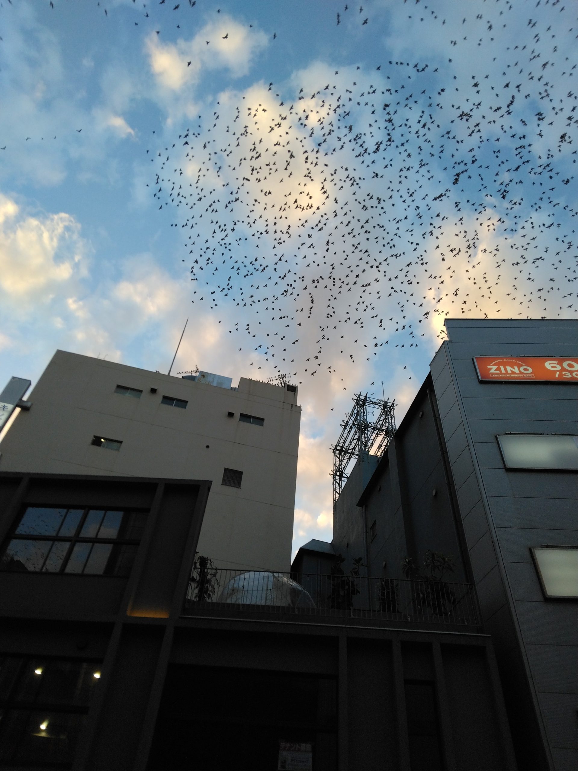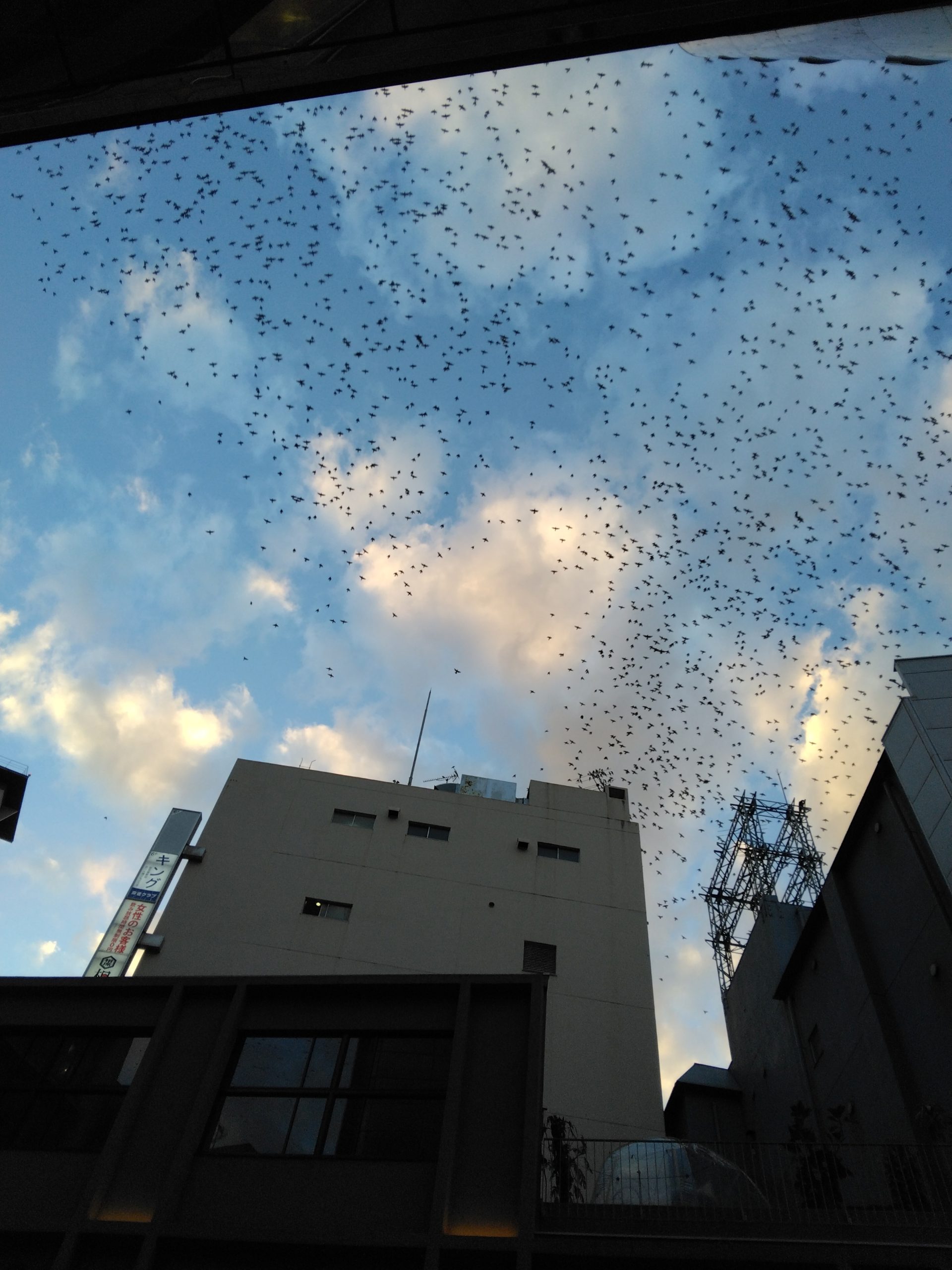 上記は新聞報道ですが、夕方ムクドリ 本当に凄いです