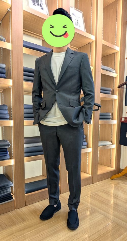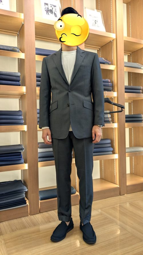 こちらのお客様も写真を撮ることは快諾されましたが、「こんな素材のスーツにインナーがTシャツでいいの?」と仰るくらいですから、その高級感はもって知るべし。と言うところでしょう。