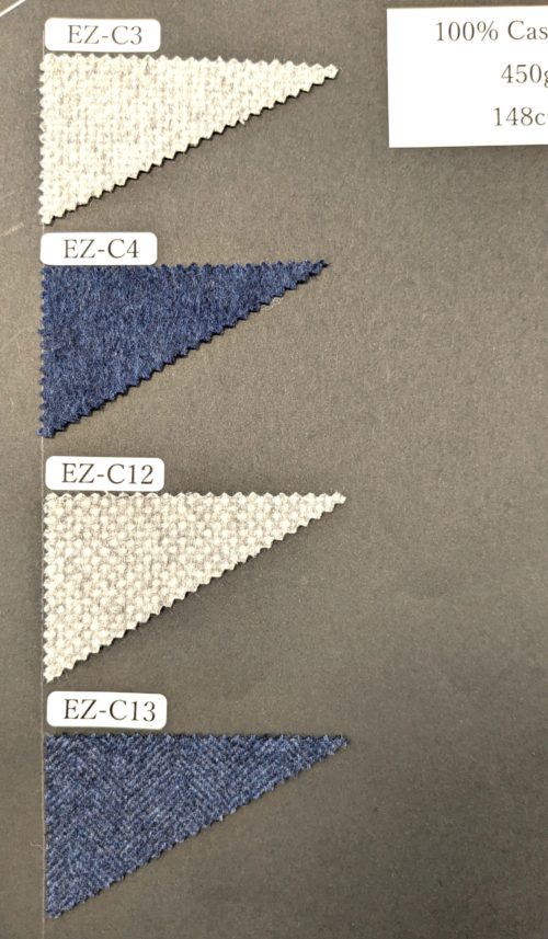 今回は定番の5色以外に、写真のブルー無地やヘリンボーン、ライトグレーのバーズアイ等の生地も追加しました。(使用しているカシミアの量が多いため、フェアでの価格も¥11.000高くなります)