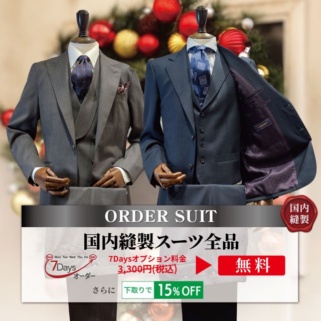 国内縫製スーツ全品:7Daysオーダーオプション料金(税込3,300円)が無料!