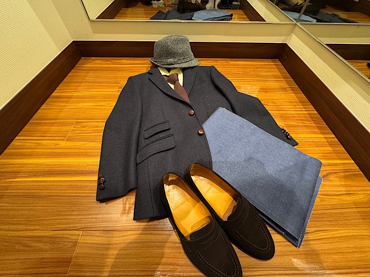 こちらはデニスラにハリスツイードのジャケット、インナーはオックスフォードシャツでタイドアップ、足元はスエードのローファーと言ったオフ寄りのビジカジスタイルです。