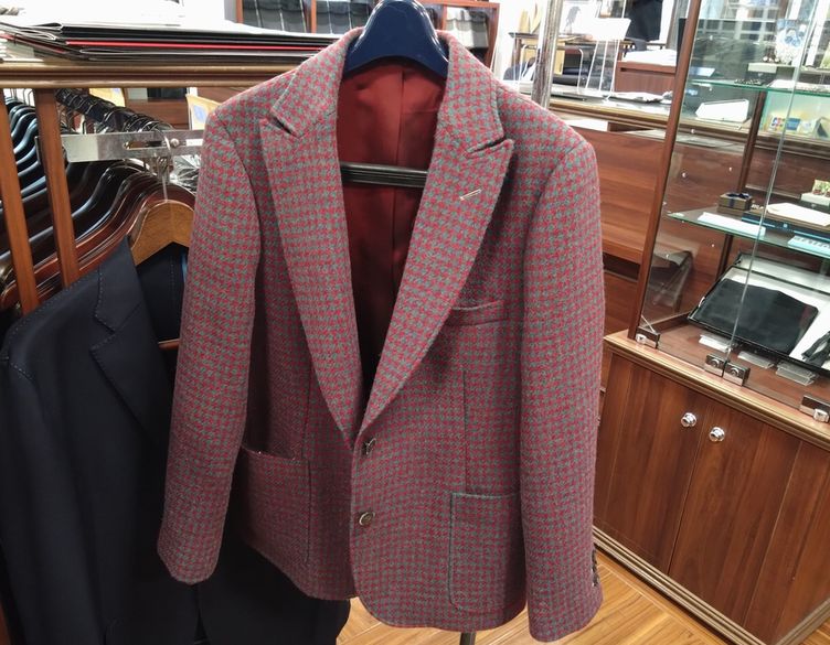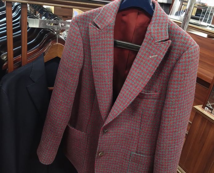 ハリスツイードのエンジ×グレイの千鳥格子のジャケットです。