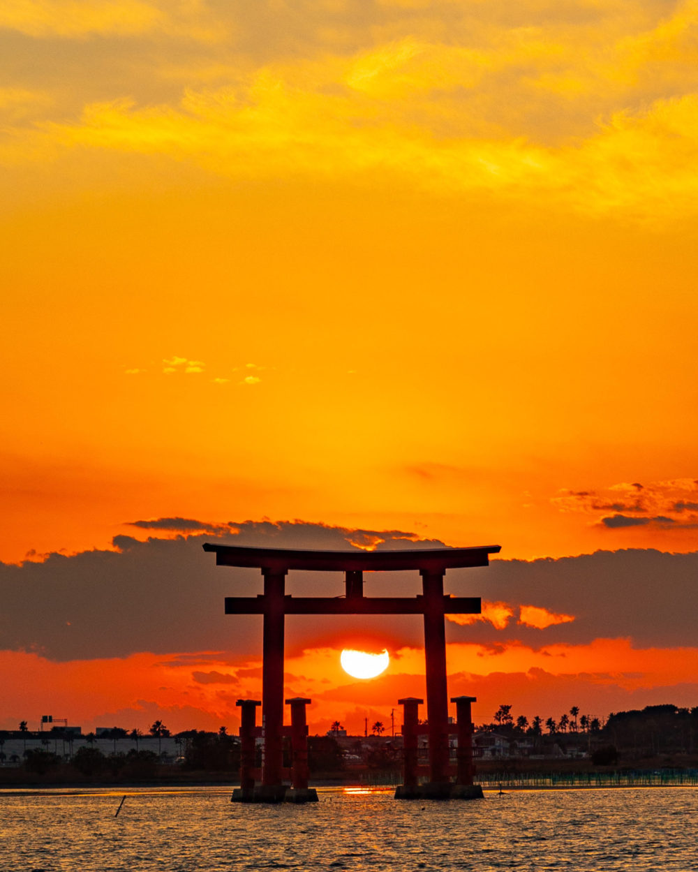 冬至前後一か月くらい限定で鳥居の中に沈む夕日が見られる絶景スポットです。