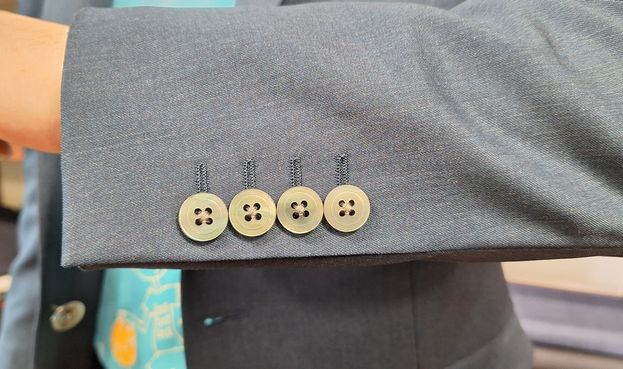 袖ボタンも、4っ釦で貝フーボタンのグリーンで合わせました。