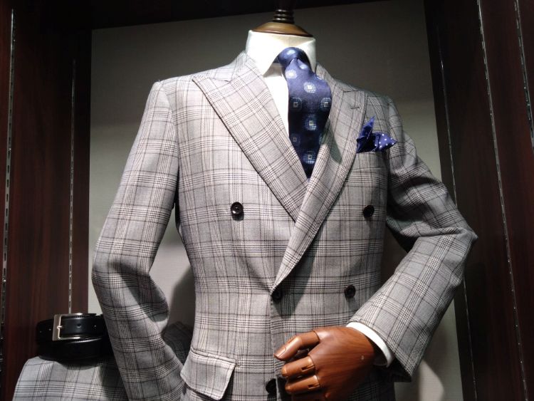 グレー チェック柄 × ブルー小紋柄ネクタイ