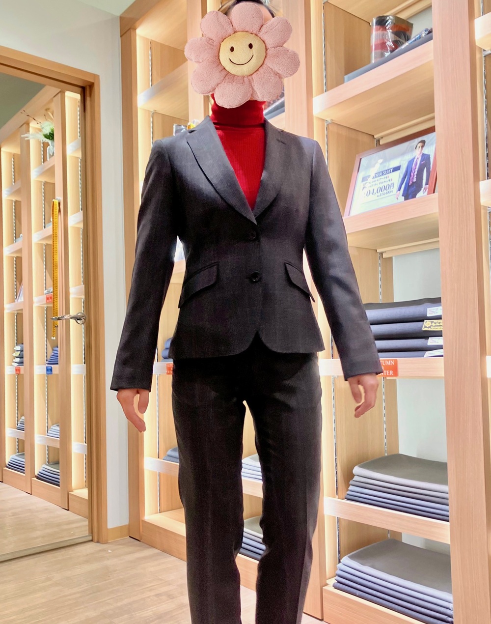 お仕事用のパンツスーツですが、色柄はわりと自由とのことで。ブラウン×チェックのウール100%の生地を選んでくださいました。