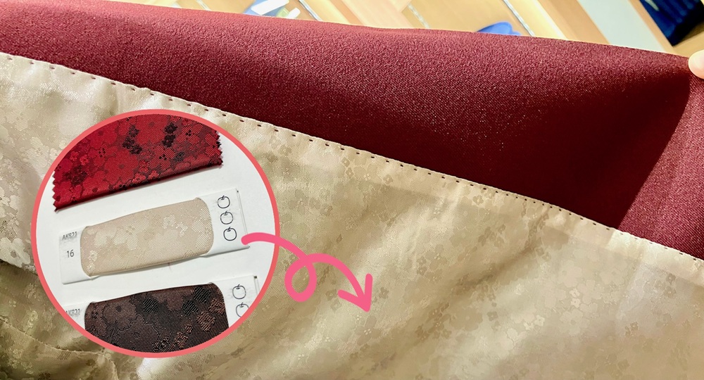 裏地も素敵でしたよ!柄キュプラの中でも、人気の花柄。その中でも、明るいベージュを選んでくださいました。とても可愛らしい組み合わせです✨
