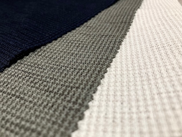 メランジ生地は、2色以上の色糸を撚り合わせて織られます(霜降り糸や杢糸を使う)