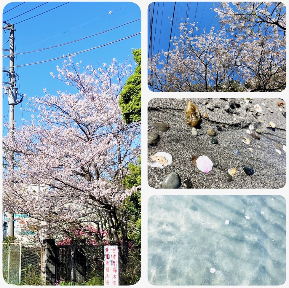 散った花びらが風で巻き上がり、砂浜や海面まで届いていました。本物の桜の花と打ち上がったサクラガイのコラボ 季節限定の良い光景に遭遇してありがたかったです。