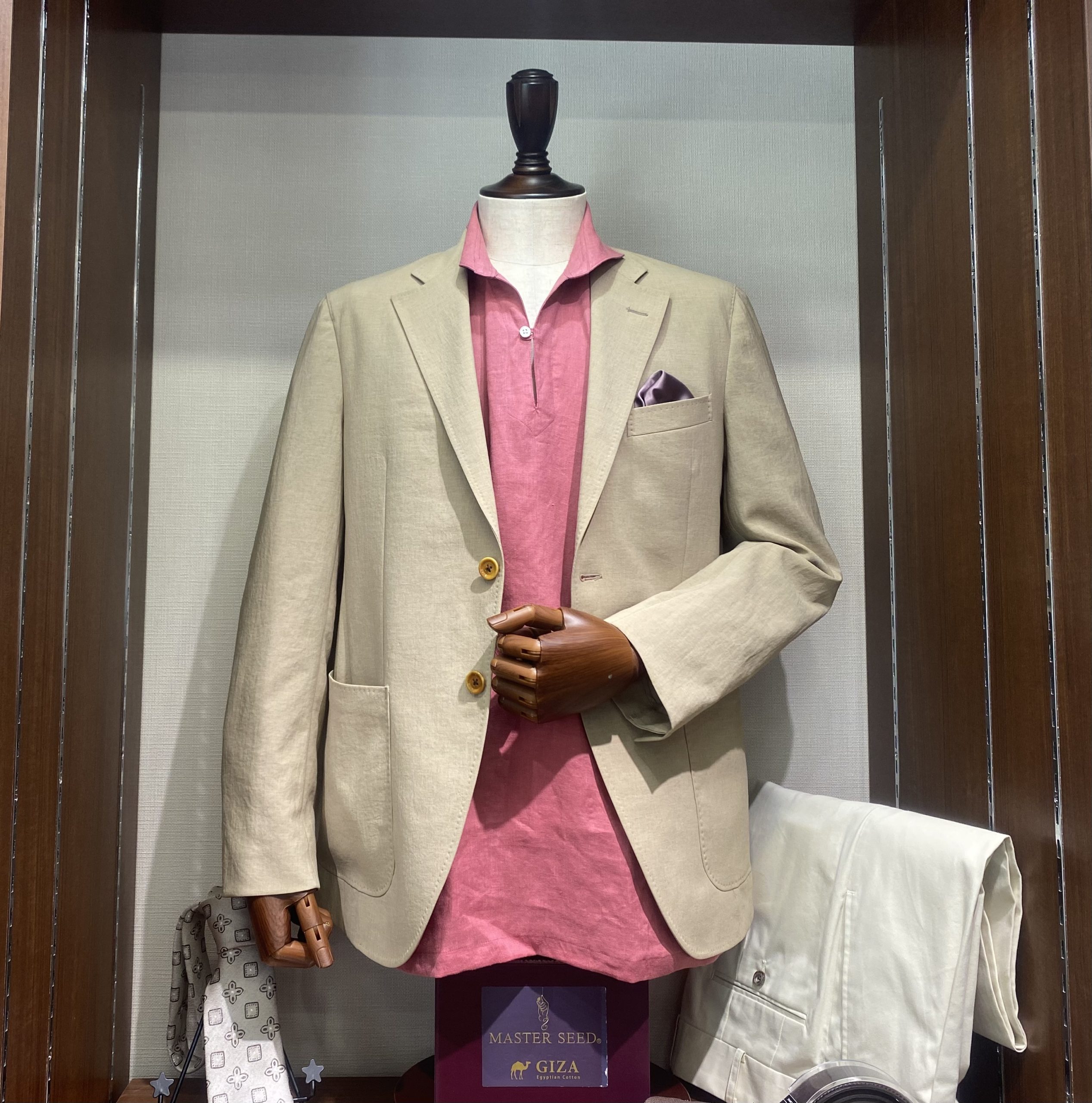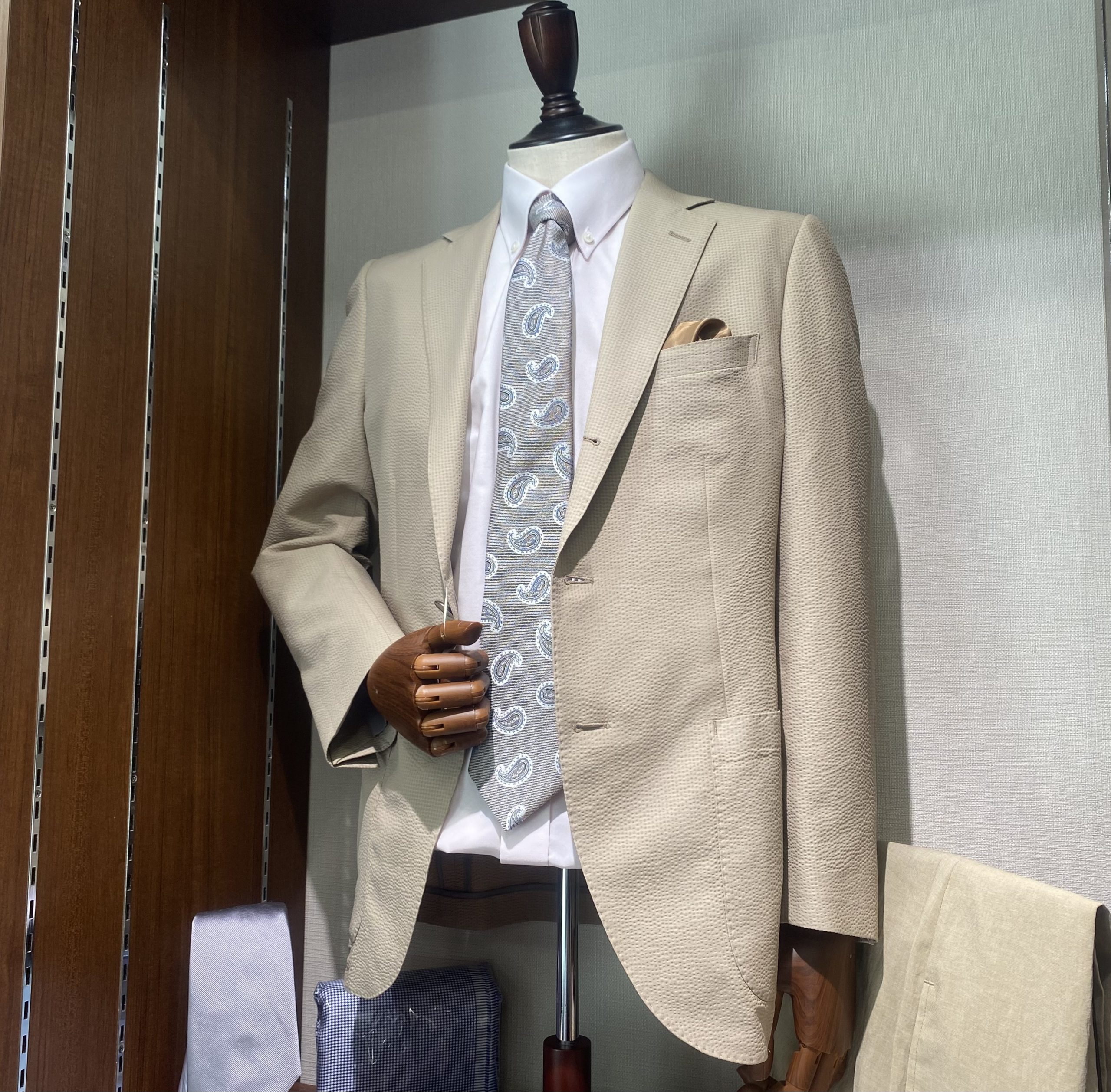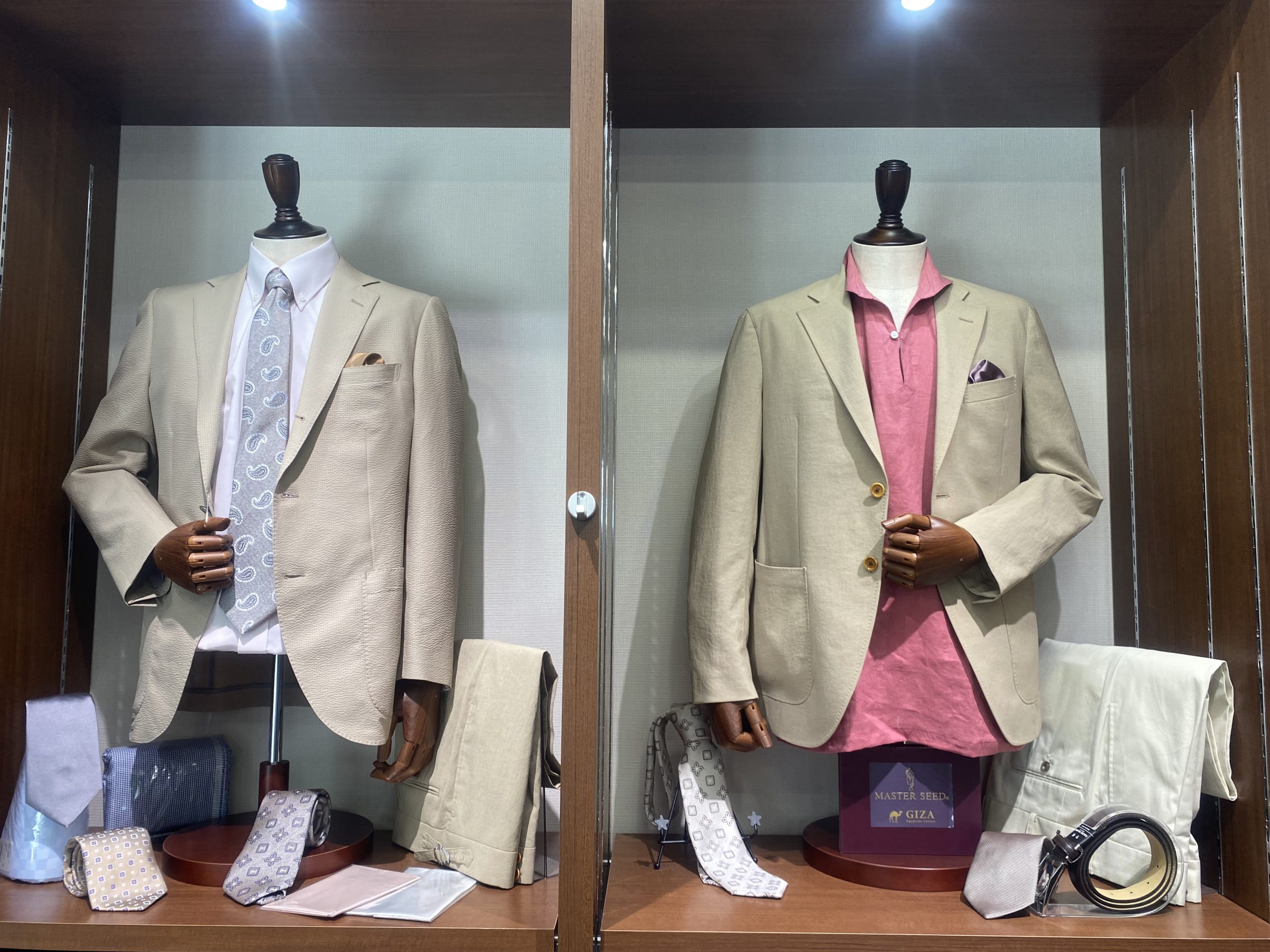 新宿店には定番のウール素材から、ストレッチが効き、手入れがし易い機能性素材まで様々なベージュ生地をご用意しております。