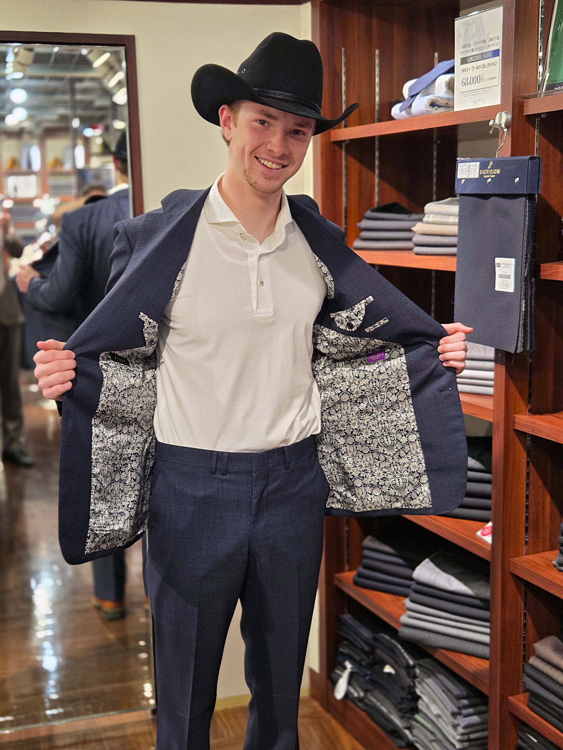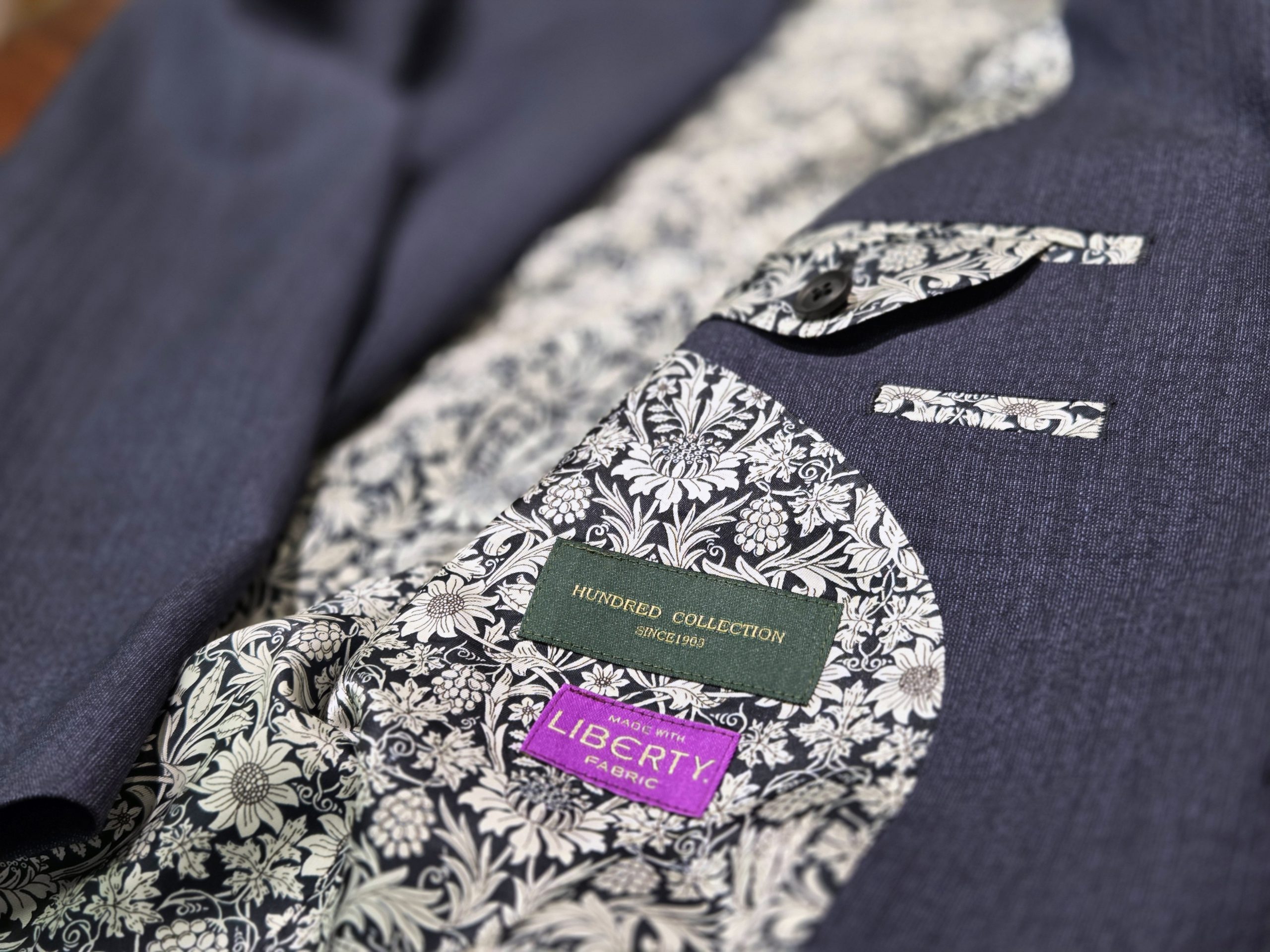 選んだ生地は紺ヘアライン、釦は水牛釦、裏地はリバティ。