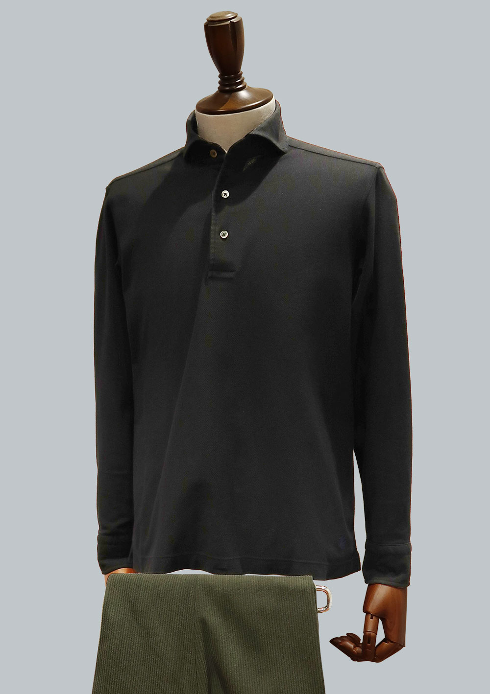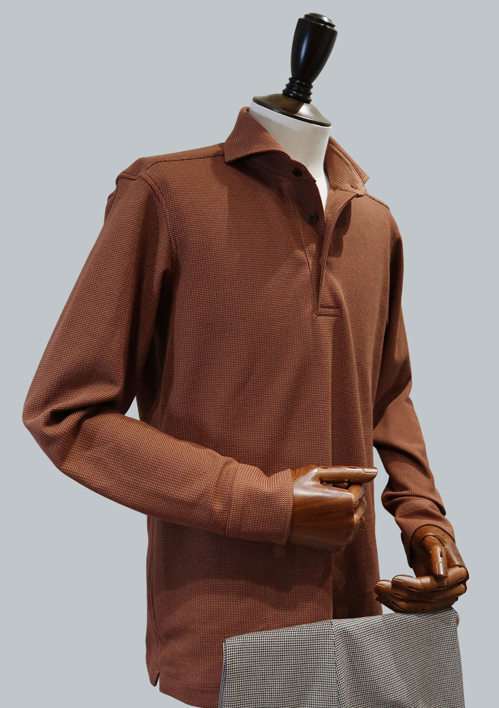 既製品では中々見かけないカフス付の長袖にした事によりポロシャツでありながらよりドレッシーで高級感を演出。