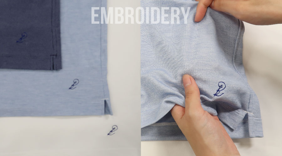 ポロシャツ専用生地はポリエステル100%素材と、綿ポリ交編素材(伊アルビニ社)の二種類をご用意しております。