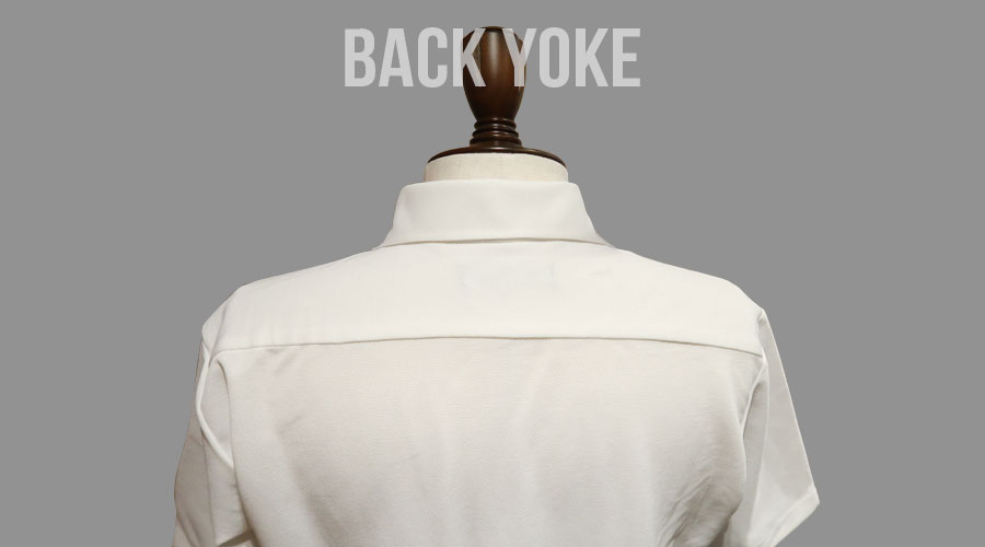 背を一枚で作らず、“ヨーク”をつけることで、カジュアルに見えがちなポロシャツに立体感を出し、ドレススタイルを表現。