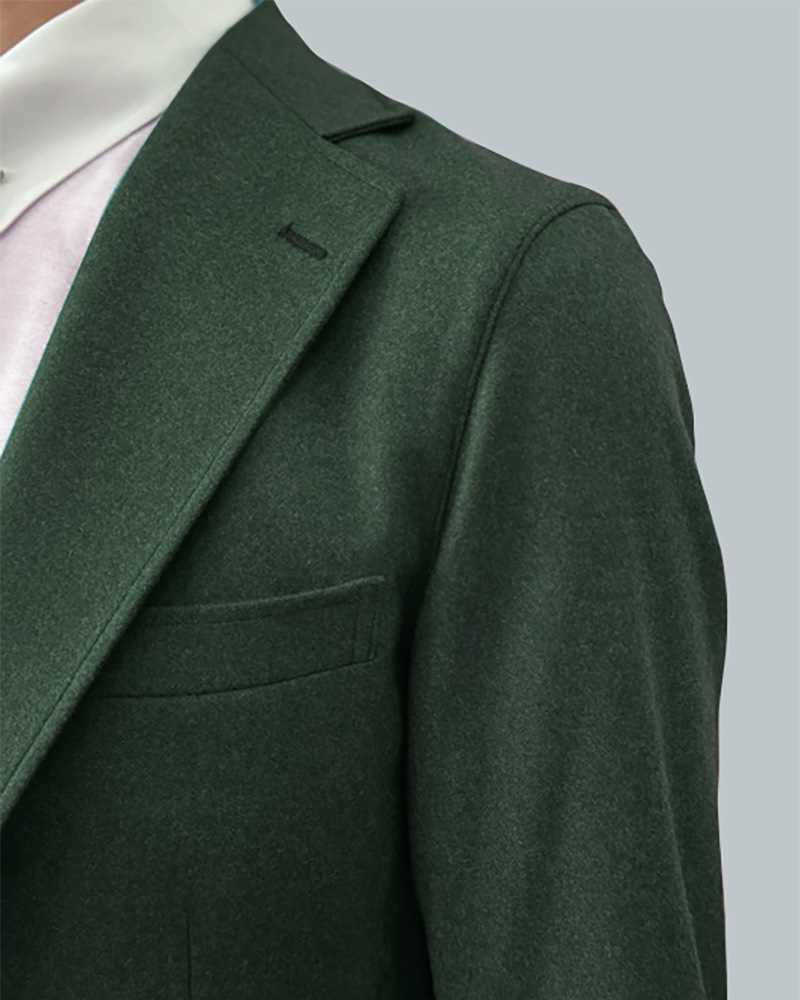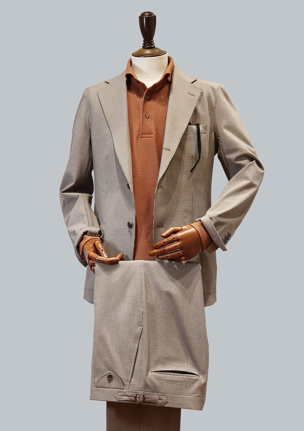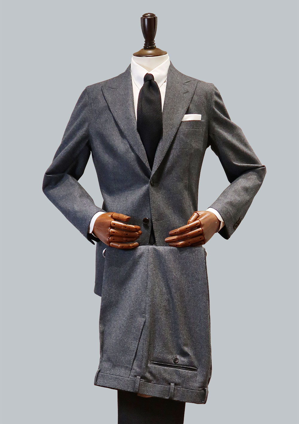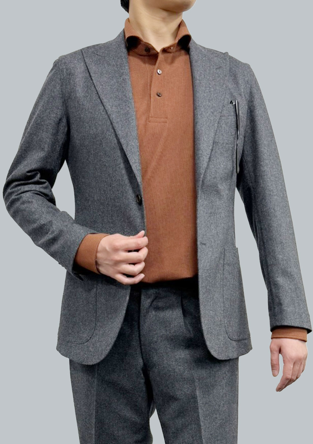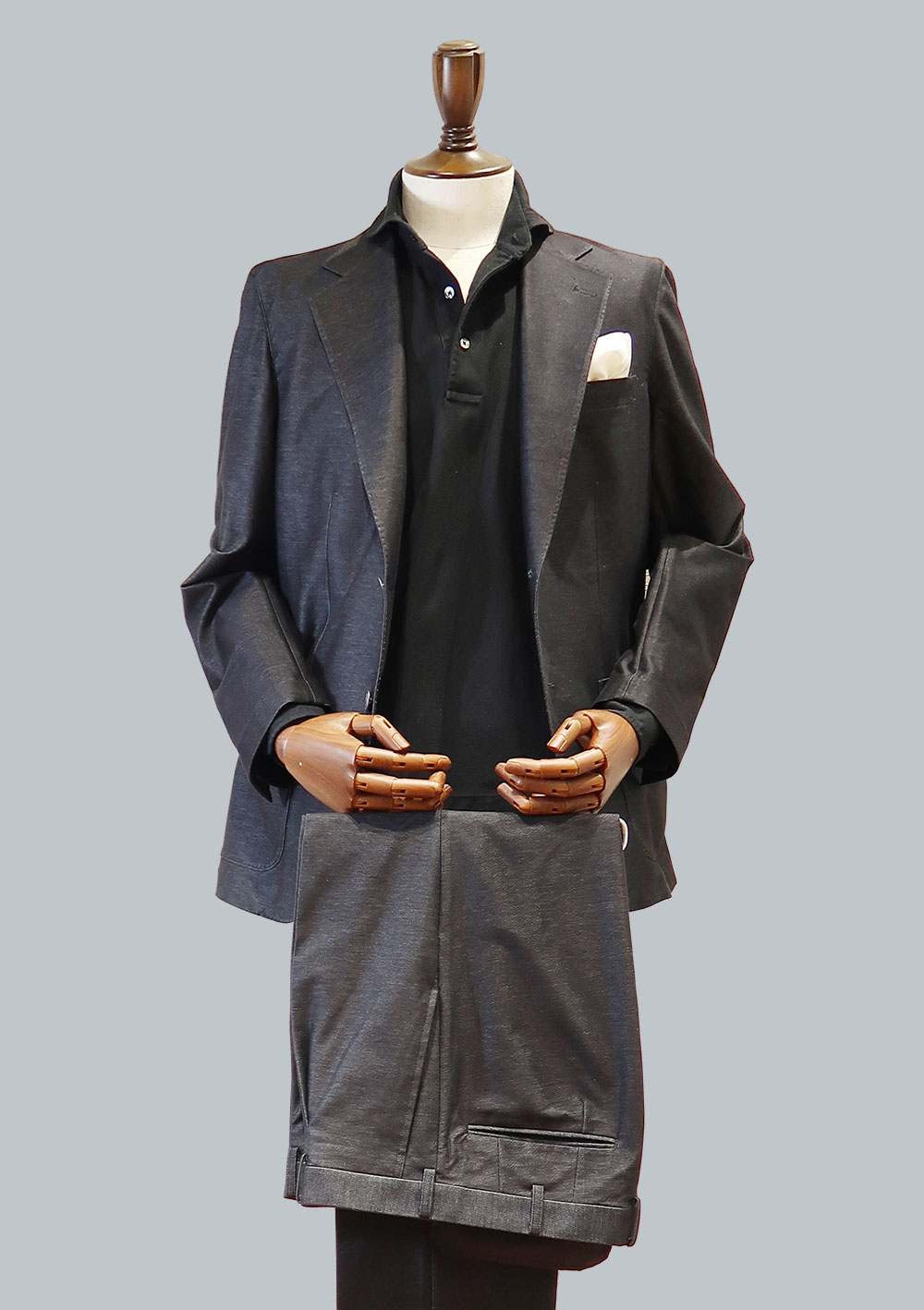 吸湿発熱素材である東レソフトサーモを使用したT/R素材。裏起毛による暖かさとしなやかな肌触りが特徴で、上品な光沢とウールの様な風合いが高級感を演出します。