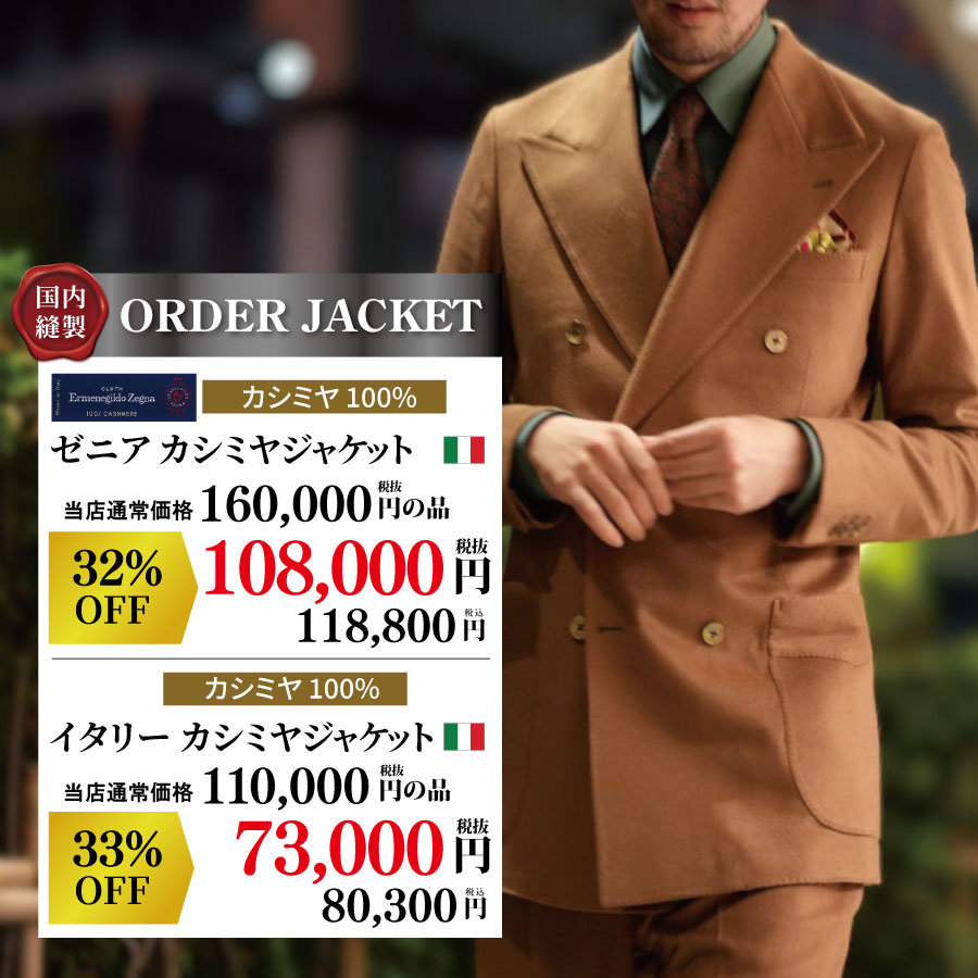 イタリーカシミヤのオーダージャケットもセール中。カシミヤ100%の上質な生地です。