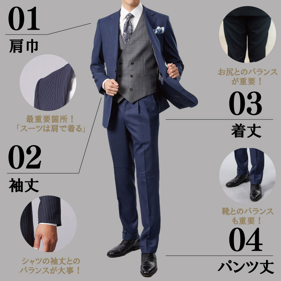 肩巾:「スーツは肩で着る」と言われるほど、肩周りのフィット感はとても重要です。サイズが大きすぎても小さすぎても印象が崩れてしまうため、自分の体にしっかりと合った“ジャストサイズ”を選ぶことがポイントです。