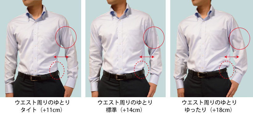 画像のようにちょっとしたバストやウエストのゆとりの違いで、見た目の印象はこんなにも変わります。オーダーなら、首回り・裄丈はもちろん、シルエットのフィット感まで自由に調整OK!自分らしい着心地とスタイルを楽しめます。