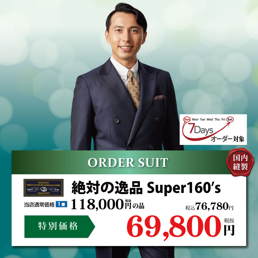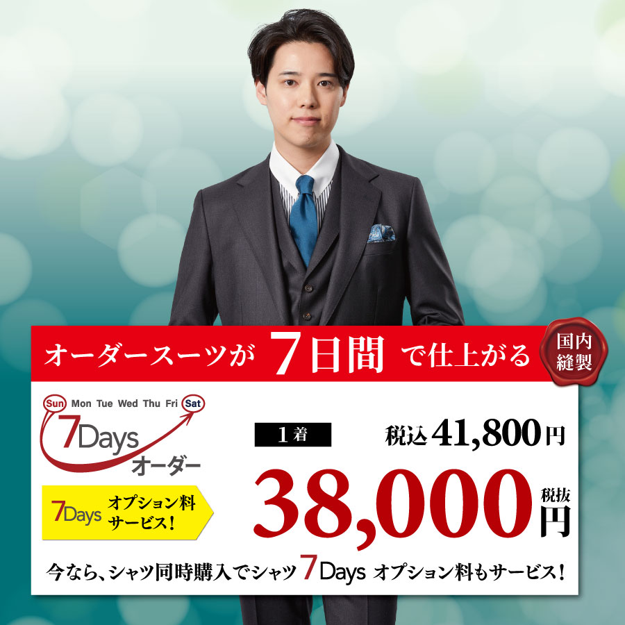オーダースーツが7日間で仕上がる7Daysオーダー!オプション料サービスで38,000円(税込41,800円)国内縫製