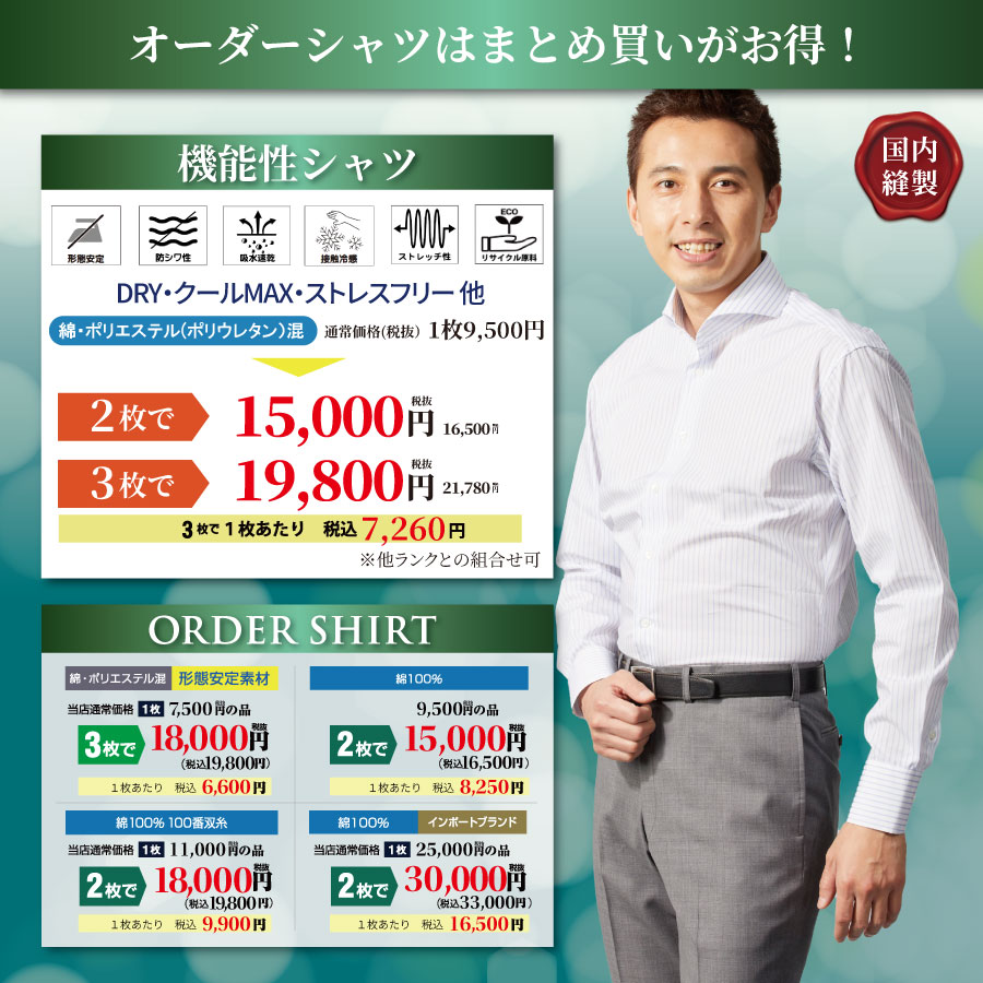 - ⇒オーダーシャツはまとめ買いがお得!安心の国内縫製