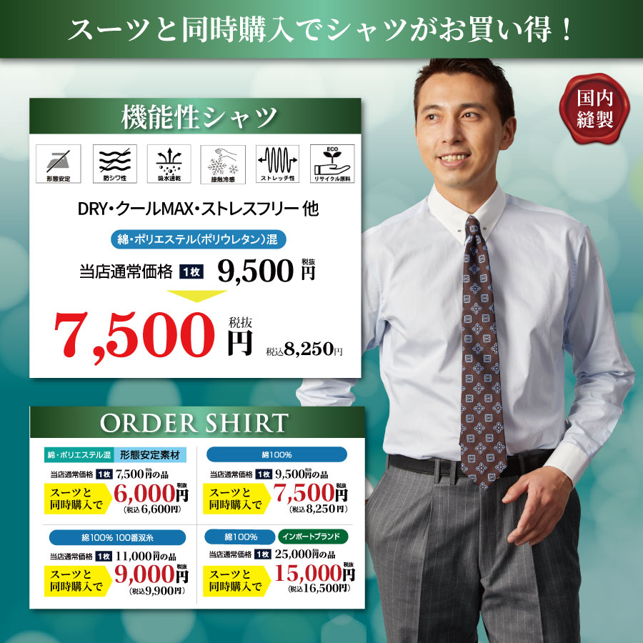 - ⇒スーツと同時購入でオーダーシャツがお得に!安心の国内縫製