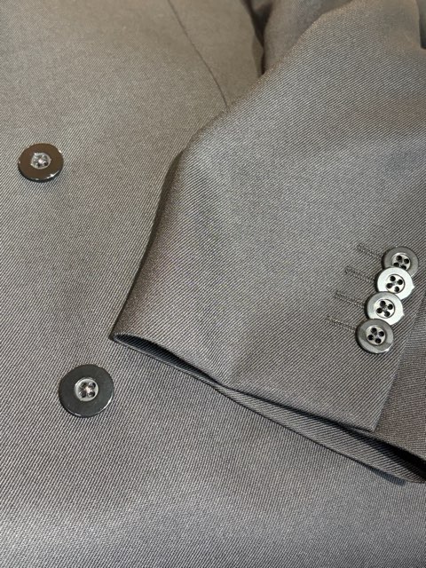 釦がダブルスーツの固いイメージを柔らかく演出しています。