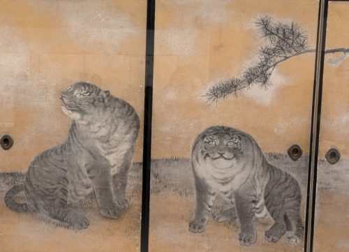 「遊虎図」(ゆうこず)ふわふわとした虎、日本には虎が生息しない為毛布を見て描いたとされています。墨量や墨の濃淡にも注目です。