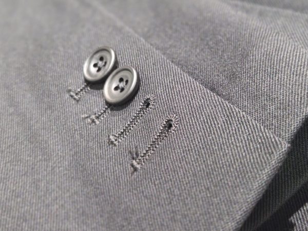 3つ釦仕様とは異なり、下襟が第1釦を半分おおい隠して見えており、
