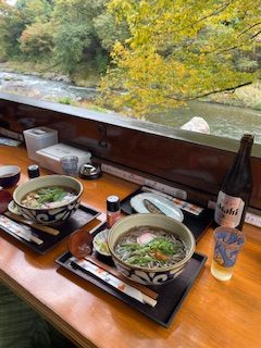 紅葉と川を目の前にして山菜そばを注文!っとその前にもちろんビールで乾杯ッ🍻