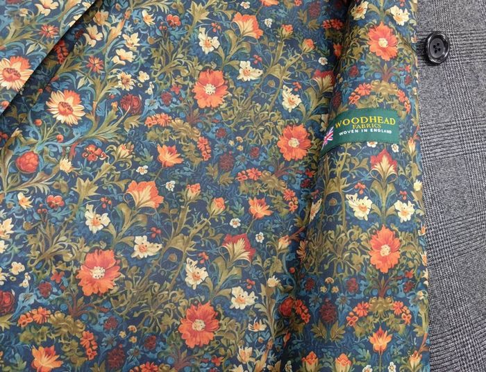裏地は、ブルー・オレンジの花々が入り乱れる華やかな柄が優雅なイメージです。