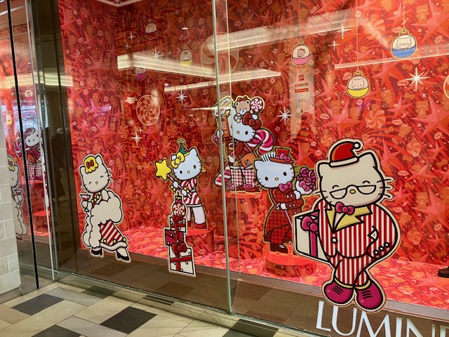 今年のクリスマスは、ルミネとハローキティがコラボをしているようで。JR立川駅のコンコース沿いも、ポスターやらウィンドウディスプレイやらが可愛く華やかです。
