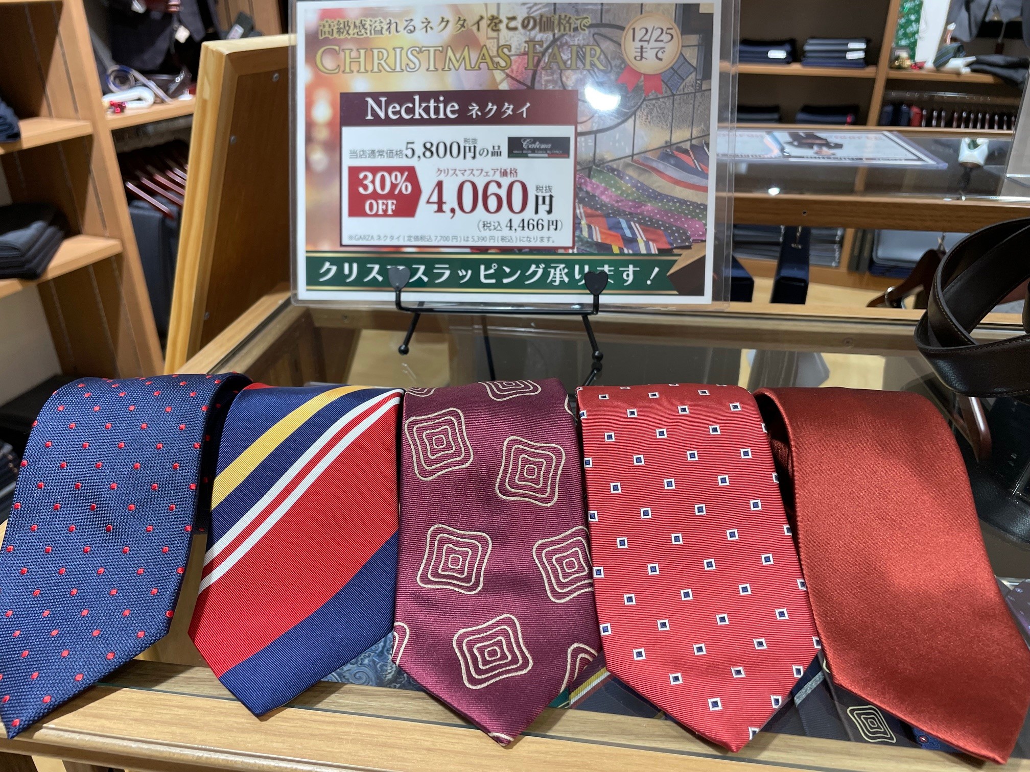 更に、お店は12月25日までクリスマスフェアー期間30%Offでご提供させていただいています。是非、この機会にビジネスとは違った使い方をするネクタイを選んでみではいかがでしょうか。
