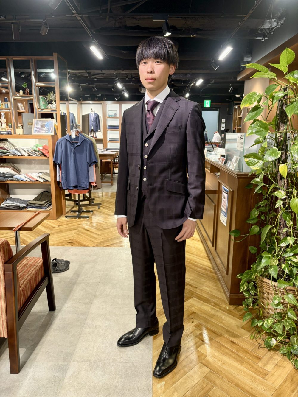 茶色のシャドーチェック柄でベスト付きのスリーピース。