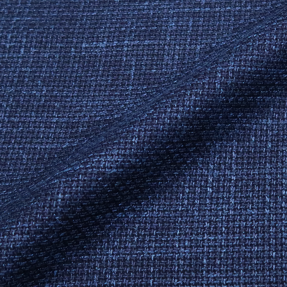 落ち着いた紺の無地で、ざっくりとした織り感が感じられる生地です。程よく力の抜けた素材感が紺のきちんとした印象を和らげ、軽快で自然な雰囲気に仕上がります。シャツからカットソーまで合わせやすく、かっちりしすぎない紺を楽しみたい方や、夏場でも表情のあるジャケットスタイルを取り入れたい方におすすめです。
