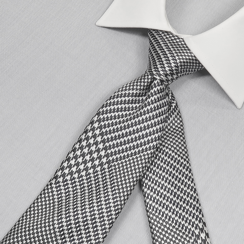 【クラシカルで引き締まった印象】のチャコールグレイを基に、華やかなグレンチェックが映える1本です。深みのある色をベースにした事により、端正なVゾーンを作り上げるのに適しており、クールな印象を演出できるネクタイです。特にネイビースーツに合わせた際の【都会的な雰囲気】は他では味わえないスタイルが確立できます。全長:144.5cm(±0.5cm個体差あり)大剣幅:8.5cm