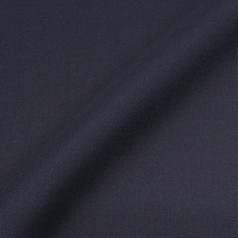 ウール50%ポリエステル50%の春夏向け素材の濃紺無地で、軽さとハリ感のバランスが良く、扱いやすいのが特徴です。深みのある濃紺が落ち着きと誠実さを演出し、ビジネスシーンに適した安定感のあるスーツに仕上がります。