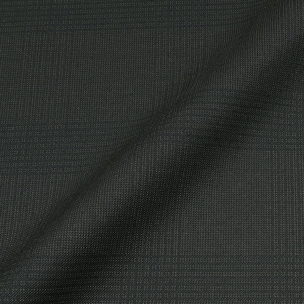 ウール50%ポリエステル50%の春夏向け素材の黒緑チェックで、65mm×55mmの格子が落ち着いた中にさりげない個性を添えます。黒をベースにグリーンが溶け込む深みのある配色がシックで、大柄ながら主張しすぎず、洗練された印象のスーツに仕上がります。