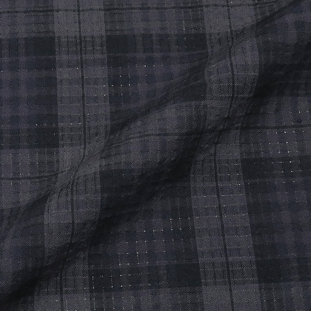 先染めのコットンとポリエステルを使用した経糸を等間隔に抜き、糸を抜いた部分と抜いていない部分を作ることで、通気孔が生まれ蒸れにくく、「軽い風合い」と「通気性のある」快適な着心地を楽しんでいただける生地です。